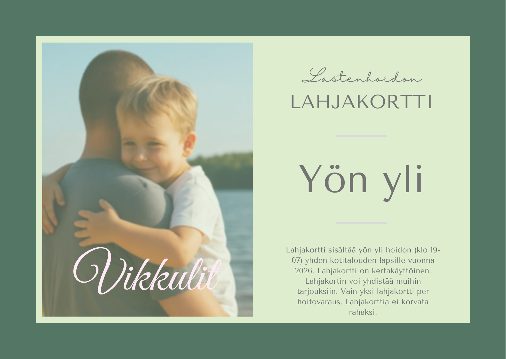 Meillä lastenhoito on paljon enemmän kuin arjen apua – se on lämmintä, turvallista ja arvostavaa kohtaamista, jossa jokainen lapsi kohdataan juuri omana itsenään. Se on lapsen perustarpeista huolehtimista sekä lapsen mielenkiinnon kohteet, toiveet ja yksilölliset tarpeet huomioivaa lapsen kehitystä tukevaa toimintaa.